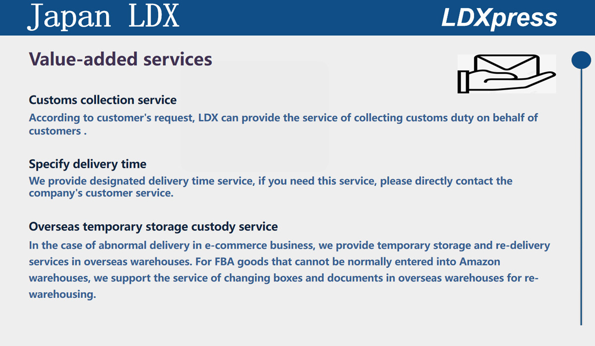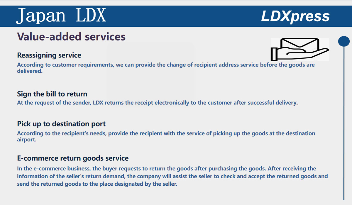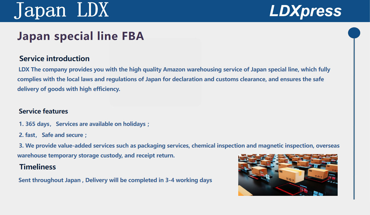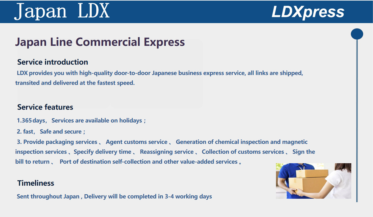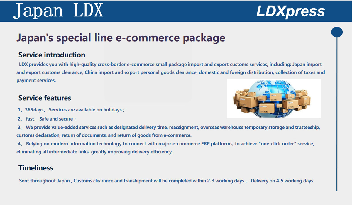 Established in 1997, LDX focus on the international express import and export agency business ( Japan Korea Taiwan Hong Kong Australia ), which includes express airport customs declaration and supervision warehouse, domestic air transport ,comprehensive logistics , B2B warehousing, sorting and packaging, transport, direct services for cross-border e-commerce,FBA segmental service in Japan, Korea, Australia e-commerce small package import and export customs clearance service.